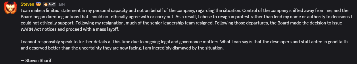 On January 31, 2026, Steven Sharif announced his resignation as Creative Director and co-founder. In his public statement, Sharif cited ethical disagreements with the Intrepid Studios Board of Directors, stating that he no longer retained meaningful control over the project’s direction and could not support decisions being made at the board level. His departure removed both the primary creative figurehead and the project’s most visible public representative.