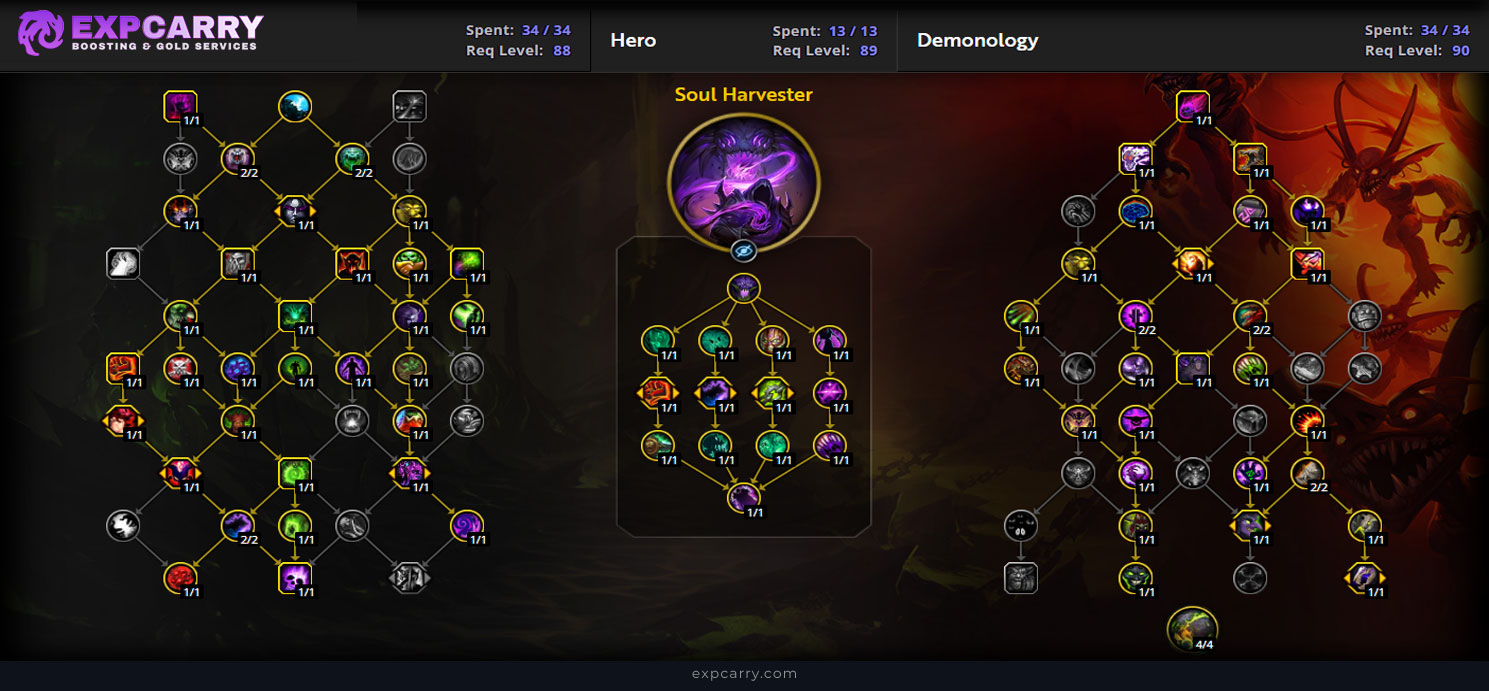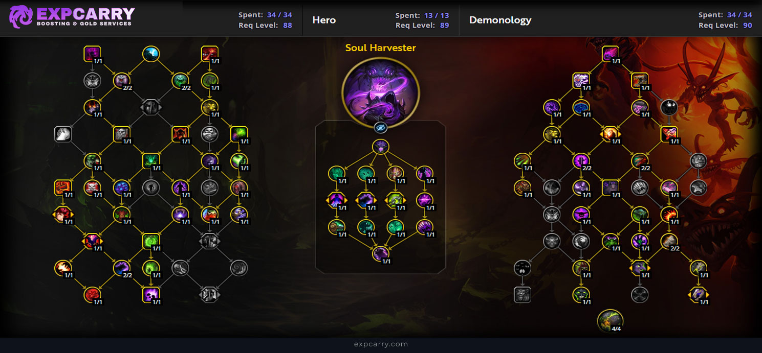 AoE-Seelenernter fuer starken gebuendelten 5-Ziel-Cleave und fluessigeres Dungeon-Spiel bei niedrigerer Zielanzahl. Wechselt zu Diabolist, wenn die Route konsequent groesseren frontgeladenen Mehrziel-Burst belohnt. Haltet flexible Knoten fuer Schattenfuror, Todesmantel, Schreckensgeheul und Fluch der Erschoepfung je nach Bedarf offen.