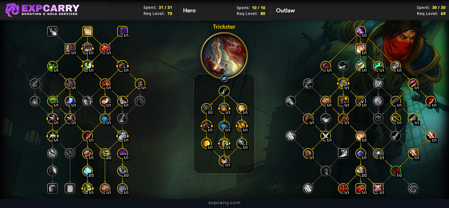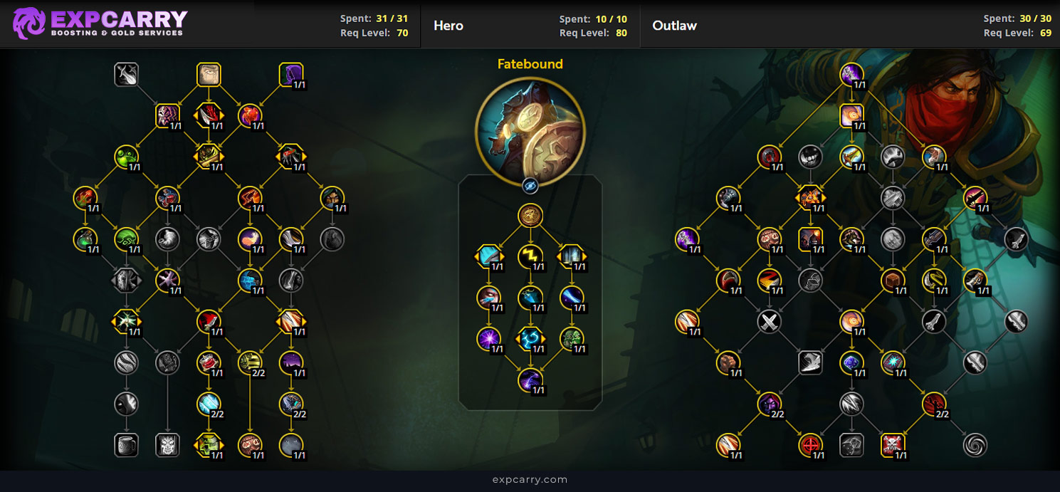 Outlaw Rogue guide - updated for The War Within Patch 11.2.5 Season 3. This guide follows the reference structure and focuses on current PvE setups for raids, mythic plus, and delves, plus PvP strategies for solo shuffle, 2v2, 3v3, and RBG. It covers talents, rotation priorities, stat priority, gear approach, and practical tips to maximize Outlaw performance. For raids and keys, Fatebound is the default hero talent for smoother single target, while Trickster is a stronger but harder cleave alternative that most high Mythic plus players prefer.