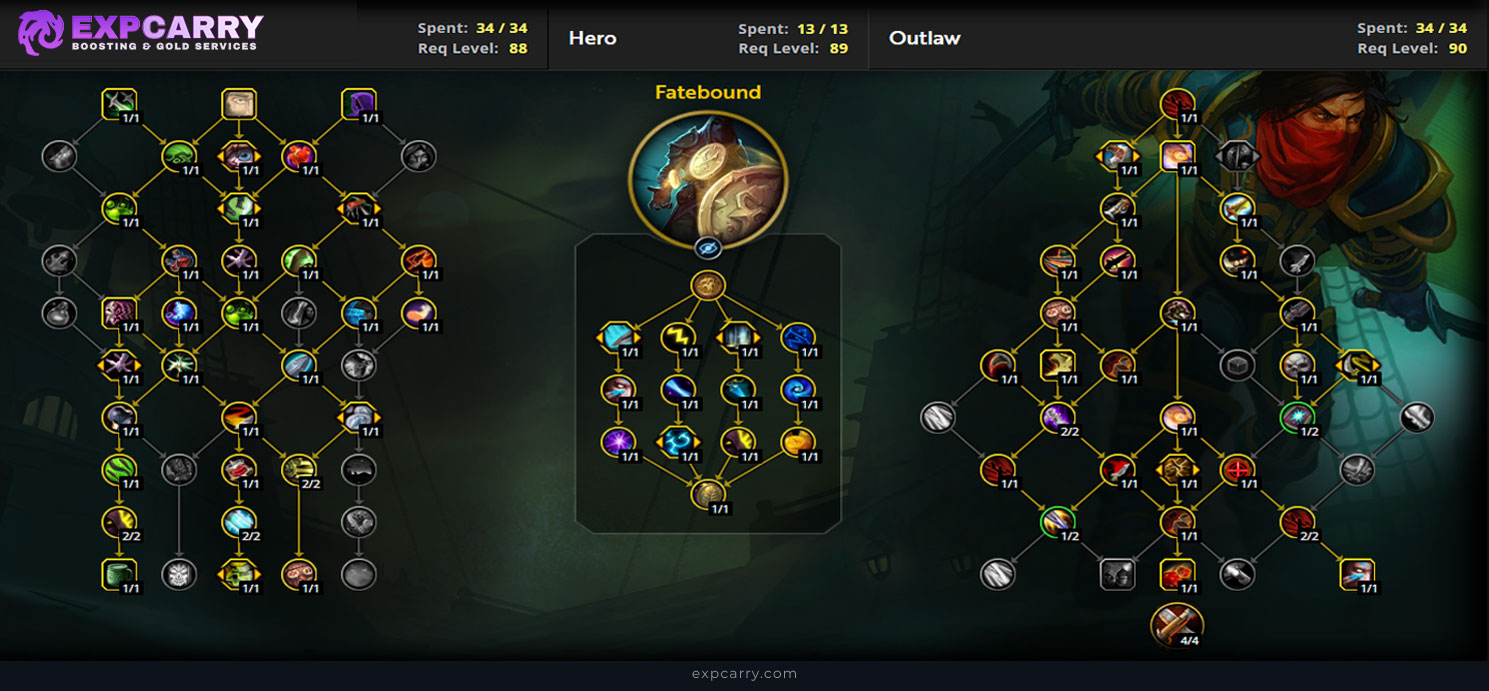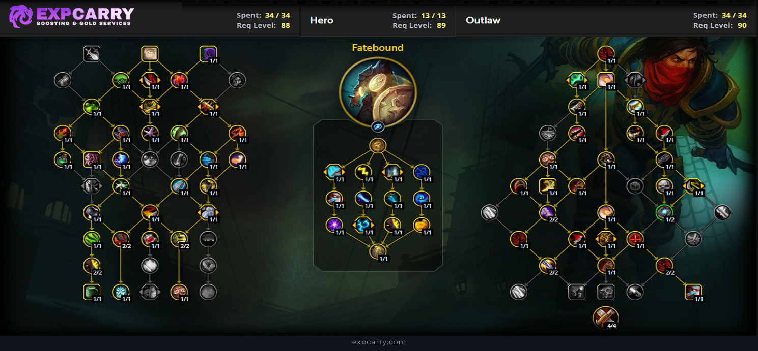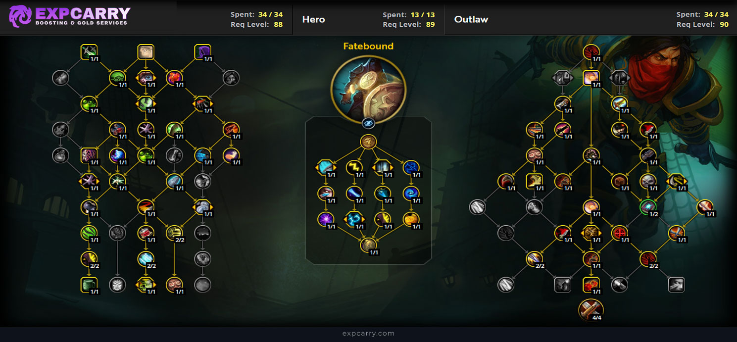 Outlaw Rogue guide - updated for WoW Midnight Season 1. This guide follows the same reference structure and focuses on current PvE setups for raids, Mythic+, and delves, plus PvP strategies for Solo Shuffle, 2v2, 3v3, and RBG. It covers talents, rotation priorities, stat priority, gear approach, and practical tips to maximize Outlaw performance. For raids, Fatebound is the default hero talent for smooth single-target damage. In Mythic+, Fatebound is also the higher-performing AoE choice, while Trickster is now the more niche alternative rather than the default dungeon recommendation.
