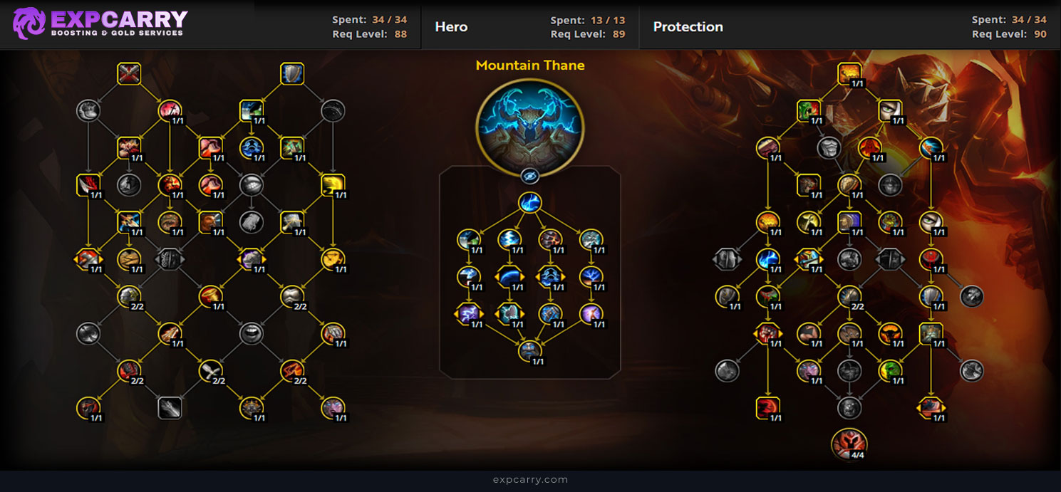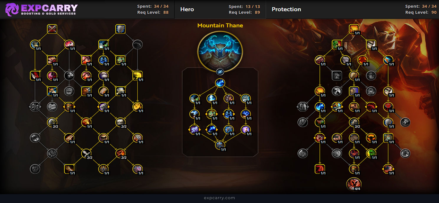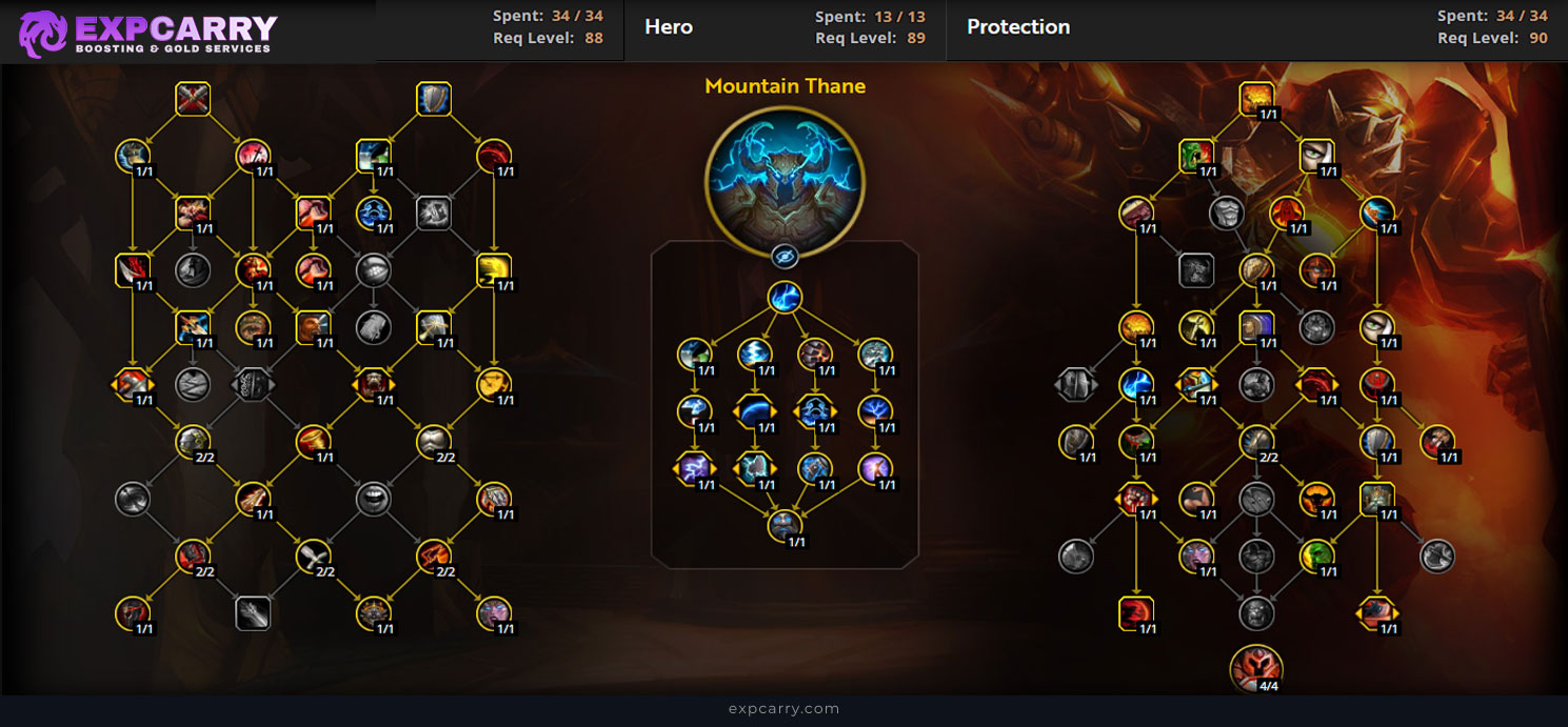 The main Mythic+ build leans into Mountain Thane and repeated pull control. It values Thunder Clap, Revenge, Shockwave, and broad utility over narrow boss-only optimization. The goal is to stay durable while keeping packs locked down and feeding your group clean, stable pulls.