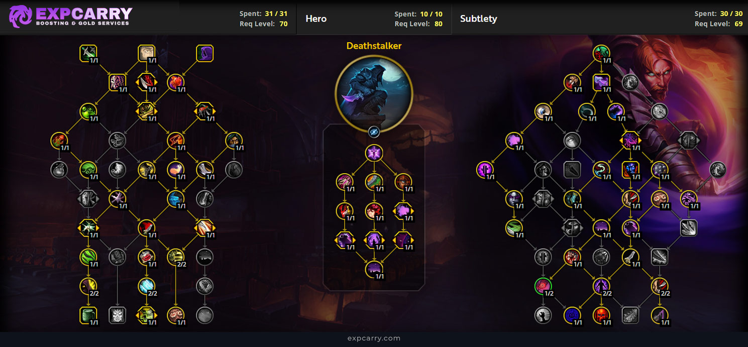 Deathstalker is still a strong baseline, providing reliable sustained pressure. Trickster can be considered in comps that play very aggressive, short games with sharp burst. Core PvP talents remain Smoke Bomb, Shadowy Duel, and at least one defensive or control talent tailored to the comp. Adjust picks for extra stuns or anti-magic tools when needed.