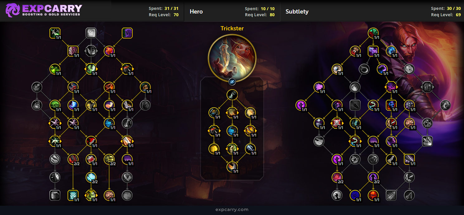 Focus on survivability nodes such as improved Feint, shorter Cloak of Shadows cooldown, and defensive talents in the general tree. Keep core Subtlety damage talents like Shadow Dance, Secret Technique, and Flagellation, but invest more points into self-healing, crowd control, and mobility. Choose Trickster to maintain strong burst on elites; pick Deathstalker only if you prefer to kite and let Rupture and Darkest Night ticks grind enemies down.